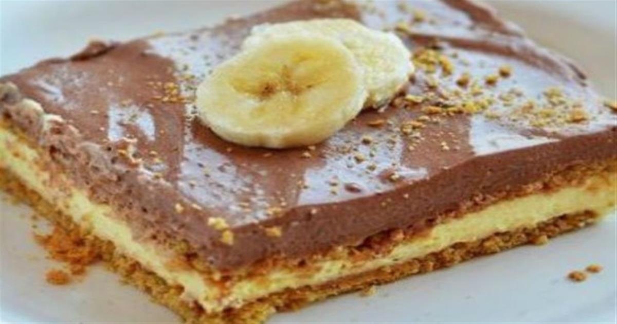 Σημείωση: Προαιρετικά, μπορείτε να βάλετε μπανάνες και μέσα στο γλυκό σας. Σε αυτή τη περίπτωση θα χρειαστείτε 3 μεγάλες ώριμες μπανάνες κομμένες σε λεπτές φέτες, με τις οποίες θα καλύψετε τη στρώση κρέμας βανίλιας. Από πάνω θα συνεχίσετε τη διαδικασία με τη δεύτερη στρώση μπισκότων και στρώση κρέμας σοκολάτας.