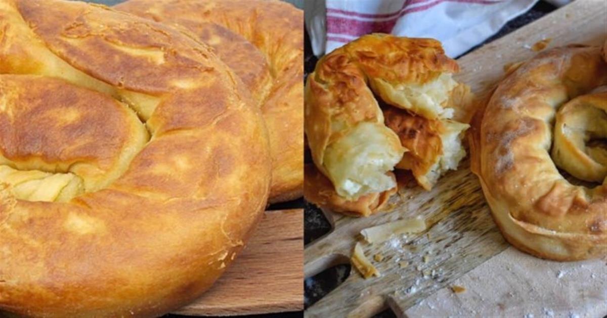 9 Στη συνέχεια, φέρνουμε το κάτω μέρος του φύλλου πάνω από τη γέμιση και στρίβουμε μέχρι να φτάσουμε στο πάνω μέρος, δημιουργώντας ένα ρολό. Φέρνουμε προς τα μέσα τη μία άκρη, τυλίγουμε τριγύρω με την άλλη και σχηματίζουμε την στριφτή τυρόπιτα (σχήμα σπιράλ – σαλιγκαριού). Ακολουθούμε την ίδια διαδικασία και για τα υπόλοιπα ζυμαράκια.