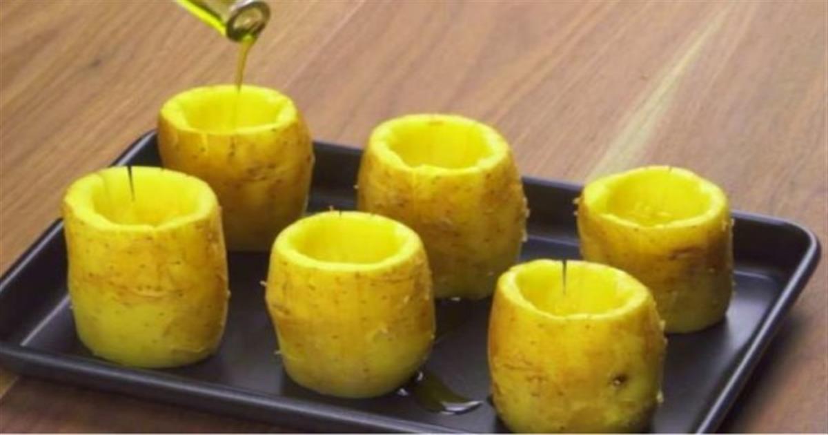 Κόβει το πάνω μέρος από 6 πατάτες και τις βάζει στο ταψί. Μόλις προσθέσει το λάδι και άλλα 3 υλικά ακόμη… Η παρακάτω συνταγή με ψητές πατάτες έχουν μία φοβερή γέμιση που λιώνει και ρέει με κάθε πηρο…