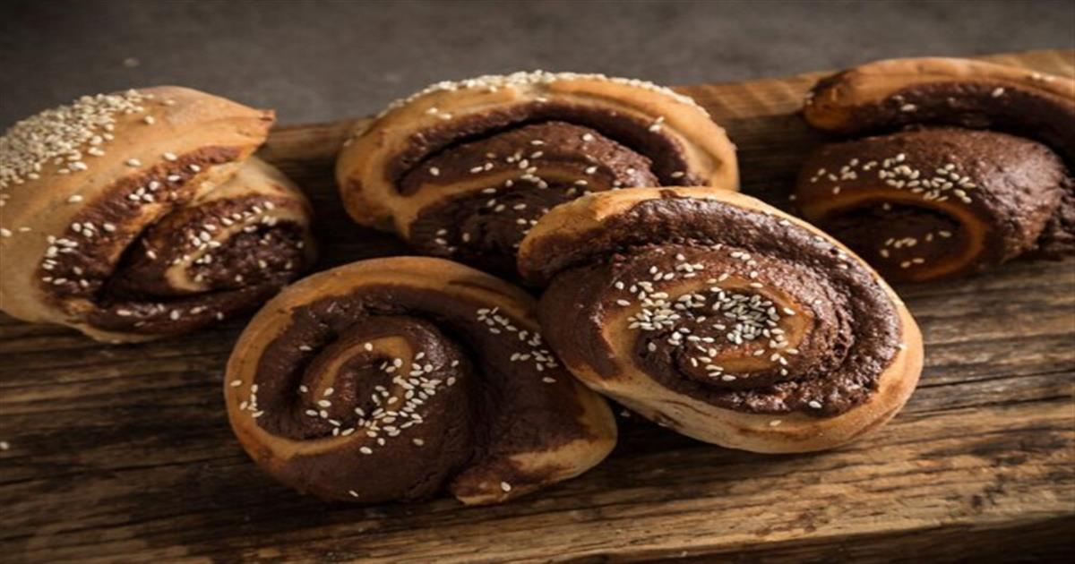6) Προσεκτικά τυλίγουμε τη ζύμη με τη γέμιση προς τα μέσα, έτσι ώστε να έχουμε ένα μακρόστενο ρολό. Κόβουμε 10 ροδέλες ίσου πάχους και τις τοποθετούμε σε ταψί περασμένο με λαδόκολλα, αφήνοντας μεταξύ τους ένα μικρό κενό. Τις πασπαλίζουμε με σουσάμι, τις καλύπτουμε και τις αφήνουμε να φουσκώσουν σε ζεστό μέρος για 20 λεπτά.