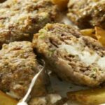 Σε πάγκο εργασίας πλάθετε το κάθε μέρος του κιμά σε ένα πολύ πλατύ μπιφτέκι και τοποθετείτε στο κέντρο του ¼ από το μίγμα των τυριών. Συνεχίζετε το πλάσιμο και κλείνετε καλά το μπιφτέκι, εγκλωβίζοντας στο κέντρο του κιμά τη γέμιση. Επαναλαμβάνετε τη διαδικασία και με τον υπόλοιπο κιμά.