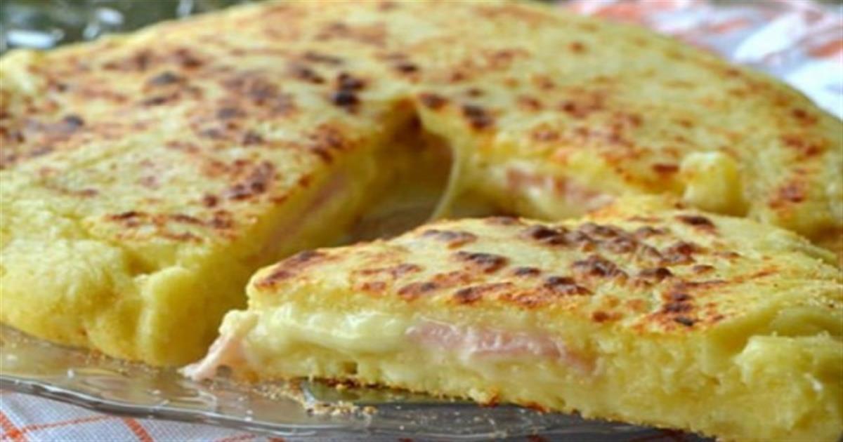 Πίτσα με ζύμη πατάτας, ζαμπόν και τυρί στο τηγάνι