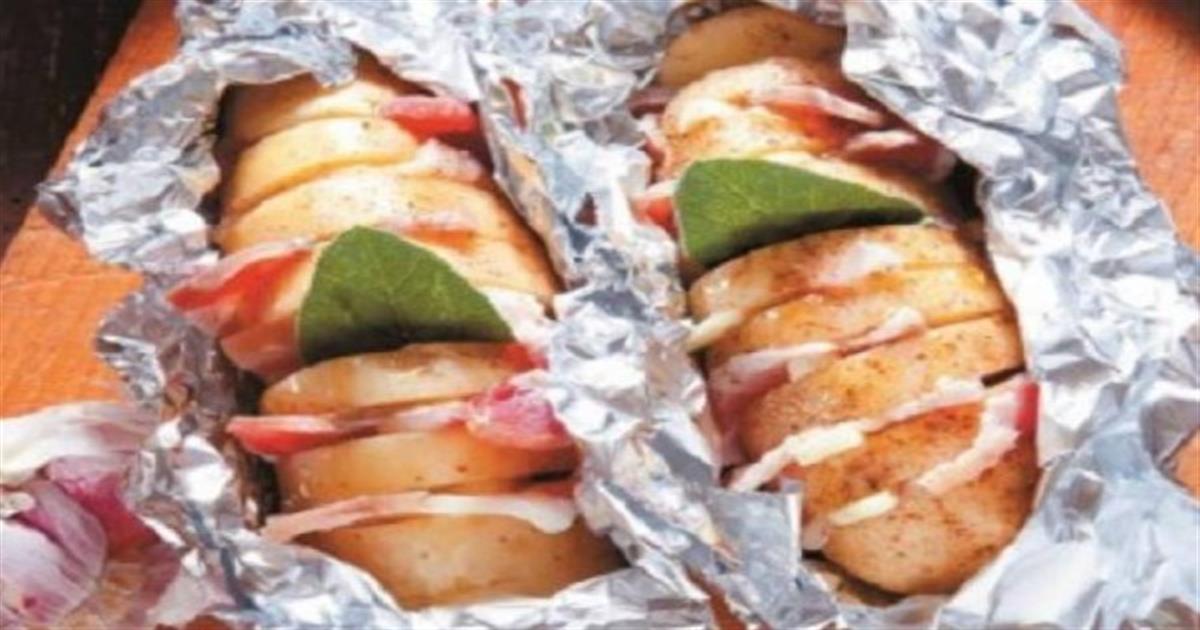 Πατάτες ακορντεόν στο αλουμινόχαρτο με σκορδόλαδο, κασέρι και μπέικον