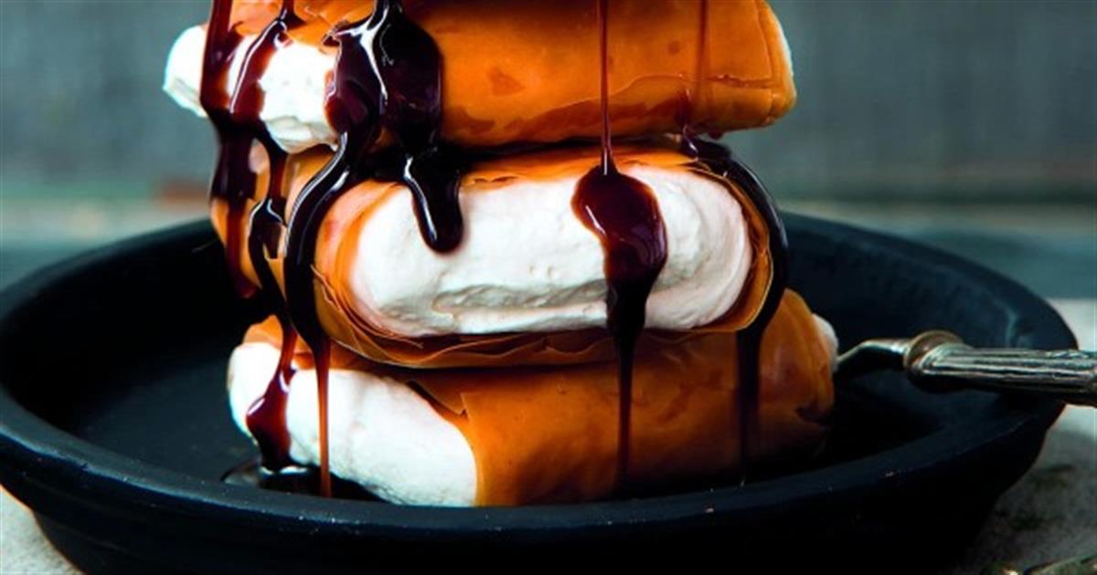- Μοντάρετε το γλυκό. Ξεφορμάρετε προσεκτικά τα φύλλα από το αλουμινόχαρτο και γεμίστε με την κρέμα. Περιχύστε με το σιρόπι και σερβίρετε. Προαιρετικά πασπαλίστε με κακάο.