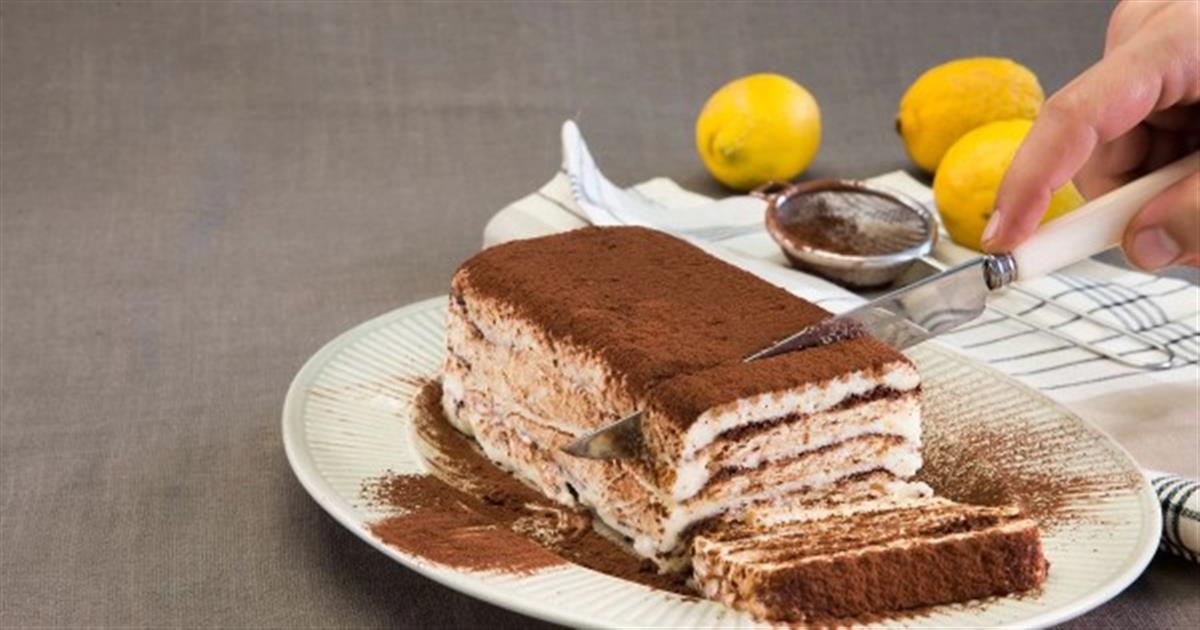 4. Όταν θέλετε να σερβίρετε, βγάλτε τη φόρμα από το ψυγείο και περάστε περιμετρικά από τα τοιχώματά της ένα λεπτό μαχαιράκι. Τοποθετήστε επάνω στη φόρμα μια μακρόστενη πιατέλα και αναποδογυρίστε το γλυκό. Πασπαλίστε όλη την επιφάνειά του με κακάο, κόψτε σε φέτες και σερβίρετε.