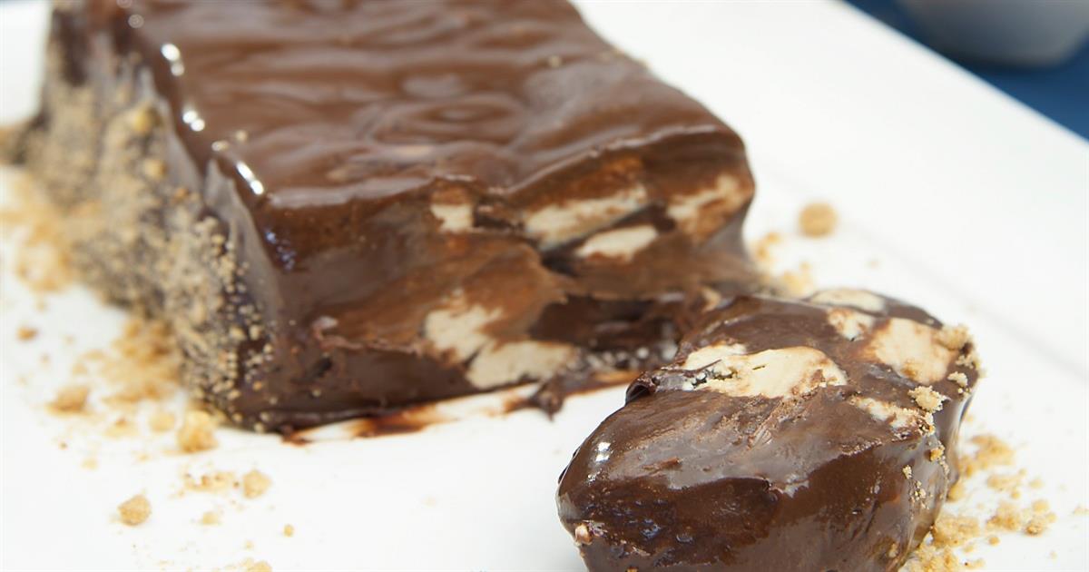- Ξεφορμάρετε τον κορμό βουτώντας τη φόρμα σε λίγο ζεστό νερό. Πασπαλίστε με το σουσάμι ή το τριμμένο μπισκότο και σερβίρετε κόβοντας κομμάτια πάχους 3 εκ.