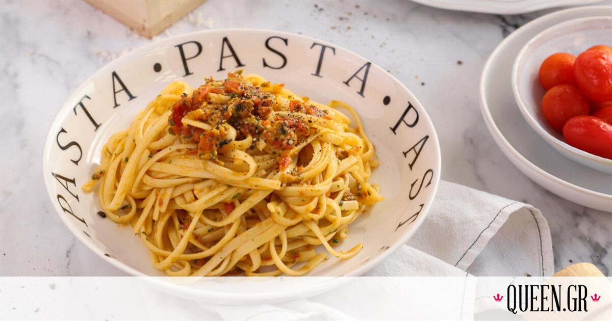 500 γρ. λιγκουίνι450 γρ. ντοματίνια100 γρ. παρμεζάνα, τριμμένη60 ml ελαιόλαδο + extra για το πασπάλισμα60 γρ. αμύγδαλα λευκά25 γρ. φρέσκο βασιλικό3 σκ. σκόρδο2 κλ. μέντα, μόνο τα φύλλαΑλάτιΠιπέριΔιάβα…