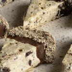 3. Προσθέτω φουντούκια, γκοφρέτα θρυμματισμένη και λίγη κουβερτούρα. Συνεχίζω τις στρώσεις μέχρι να τελειώσουν τα υλικά και κάνω σχέδια με ένα κουτάλι ή πιρούνι με την λιωμένη κουβερτούρα. Το τοποθετούμε στην κατάψυξη.