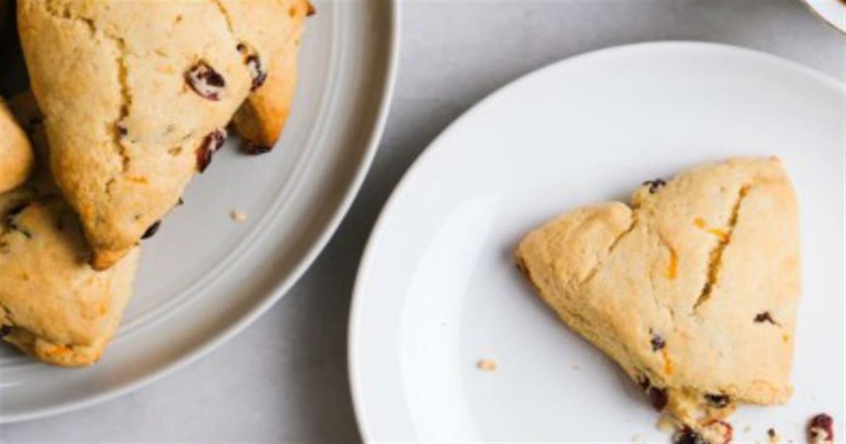 Προθέρμανε το φούρνο στους 200 βαθμούς. Σε ένα μεγάλο μπολ, πρόσθεσε πορτοκάλι, αλεύρι και baking powder. Ανακάτεψε καλά, έπειτα πρόσθεσε το κρύο βούτυρο χρησιμοποιώντας. Πρόσθεσε στο μπολ cranberries και ανακάτεψε πάλι.