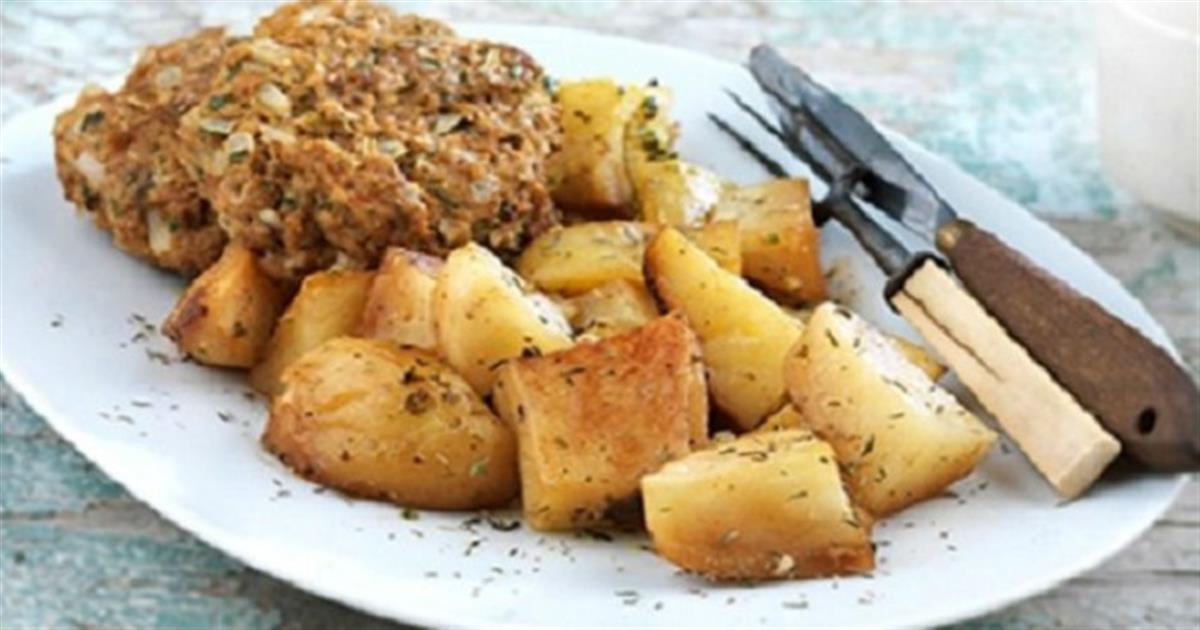 - Πλάθουμε 8 μπιφτέκια. Αφού έχουν ψηθεί οι πατάτες για 50′, τότε τοποθετούμε τα μπιφτέκια πάνω στις μισοψημένες πατάτες και συνεχίζουμε το ψήσιμο για 20-25′ περίπου ώσπου να ροδίσουν (ανάλογα το ψήσιμο που επιθυμούμε)