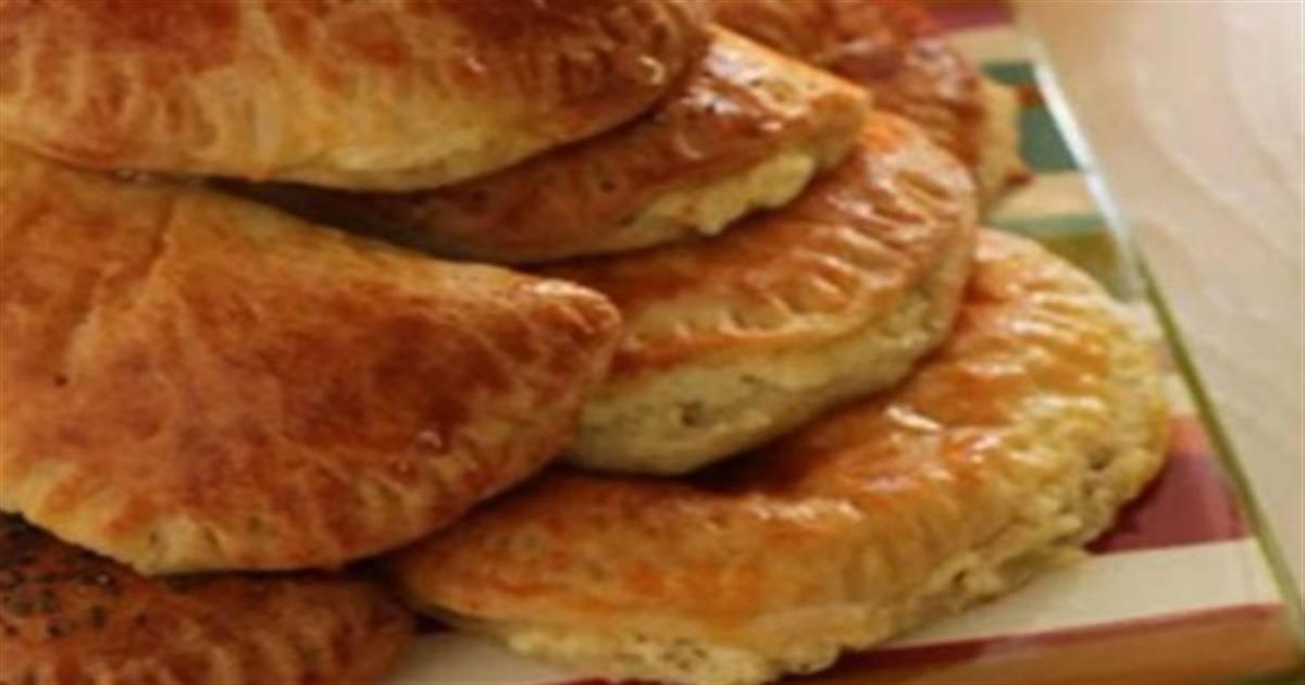 - Με ένα στρογγυλό κουπ πατ (χρησιμοποιείστε ένα φλιτζάνι με διάμετρο περίπου 8 εκ.), κόβετε στρογγυλά δισκάκια ζύμης. Βάζετε 1 κ.γ. γέμιση στο κέντρο κάθε δίσκου και κλείνετε τους δίσκους σε μισοφέγγαρα, πιέζοντας τις άκρες τους με ένα πιρούνι να ενωθούν καλά.