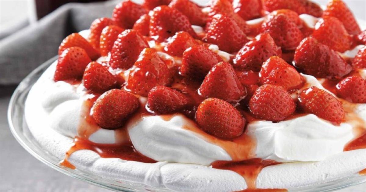 Γιορτινή Πάβλοβα: Πανεύκολα και γρήγορα με σαντιγί, σάλτσα φράουλας και 4 ακόμη υλικά