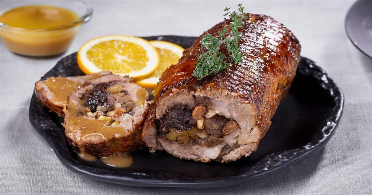 Τα αποξηραμένα φρούτα, το μέλι και το κουκουνάρι, προσθέτουν υπέροχη γεύση και δένουν τέλεια με την τρυφερότητα του γιορτινού χοιρινού σε αυτή τη συνταγή.