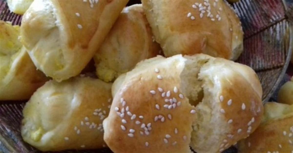 - Κόβετε λίγη ζύμη, την κάνετε μπαλίτσα, την ανοίγετε σε φύλλο, βάζετε στη μέση του μια κουταλιού γέμιση, την κλείνετε σαν πουγκάκι, έπειτα πατάτε την ένωση προς τα μέσα και το τοποθετείτε με την ένωση προς τα κάτω σε ένα ταψί που έχετε βάλει προηγουμένως ένα φύλλο λαδόκολλα.