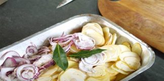 Γεμίζει ένα ταψί με πατάτες, τυρί και κρεμμύδια και το βάζει...