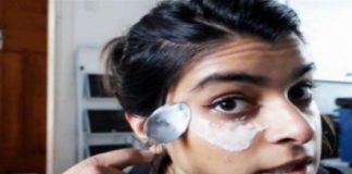 Τρίβει μαγειρική σόδα με ένα κουτάλι κάτω από τα μάτια της...