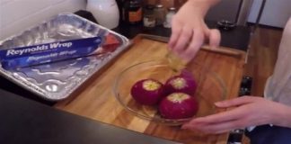 Βουτάει τα κρεμμύδια σε ελαιόλαδο, προσθέτει αλάτι, πιπέρι και τα βάζει...