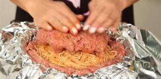 Πιέζει σε αλουμινόχαρτο κιμά και ρίχνει μέσα μακαρόνια – Θα σας...