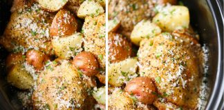 Ρίχνει στη γάστρα το κοτόπουλο μαζί με πατάτες και σκόρδο και...