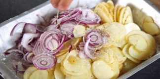 Γεμίζει ένα ταψί με πατάτες & κρεμμύδια και το βάζει στο...