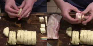 Γεμίζει κομματάκια ζύμης με τυρί και τα τυλίγει με μπέικον –...