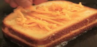 Βάζει 2 φέτες ψωμί στο τηγάνι και προσθέτει λάδι και τυρί...
