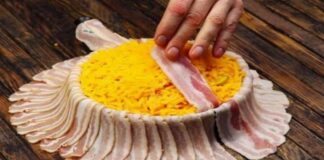 Γέμισε το ταψί με τυρί και πατάτες, το σκέπασε με μπέικον...