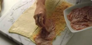 Παίρνει ένα φύλλο ζύμης το πασπαλίζει με τυρί και το σκεπάζει...