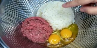 Βάζει κιμά, αυγό και ρύζι σε ένα μπολ και τα ανακατεύει...
