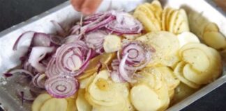 Βάζει πατάτες στο ταψί, ρίχνει από πάνω κρεμμύδια και το βάζει...