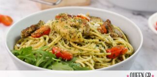 Σπαγγέτι με πανσέτα, ντοματίνια και πέστο βασιλικού