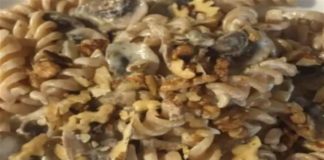 Στριφτά μακαρόνια ολικής με μανιτάρια, σάλτσα κρέμα και καρύδια