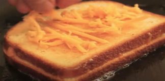 Βάζει 2 φέτες ψωμί στο τηγάνι και προσθέτει λάδι και τυρί...
