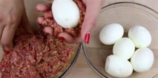 Παίρνει κιμά, τον τυλίγει σε βραστά αυγά και τα ρίχνει στο...