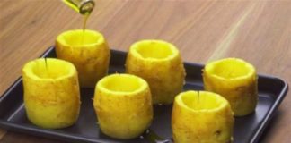 Κόβει το πάνω μέρος από 6 πατάτες και τις βάζει στο...