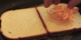 Βάζει 2 φέτες ψωμί στο τηγάνι και προσθέτει τριμμένο τυρί και...