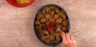 Βάζει μακαρόνια σε ταψί και πετάει πάνω τα κεφτεδάκια με σάλτσα...