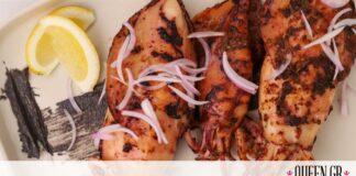 Καλαμάρι ψητό με ταραμοσαλάτα με μελάνι σουπιάς