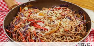 Σπαγγέτι ολικής με λαχανικά και φυστικοβούτυρο