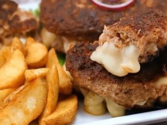 Μπιφτέκια γεμιστά με 2 τυριά και τραγανές πατάτες!