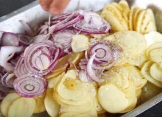 Βάζει πατάτες στο ταψί, ρίχνει από πάνω κρεμμύδια και το βάζει στον φούρνο…Το αποτέλεσμα...