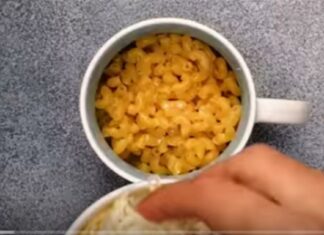 Βάζει σε μια κούπα μακαρόνια, γάλα και τυρί και τη βάζει στο φούρνο μικροκυμάτων...