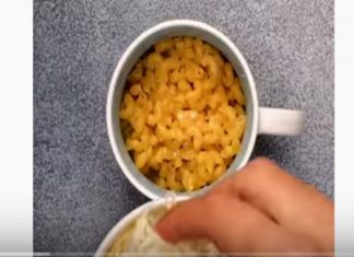Βάζει σε μια κούπα μακαρόνια, γάλα και τυρί και τη βάζει στο φούρνο μικροκυμάτων...