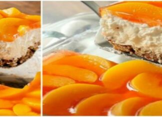 Νόστιμο γλυκό ψυγείου με μπισκοτένια βάση, επικάλυψη ζελέ και ροδάκινα