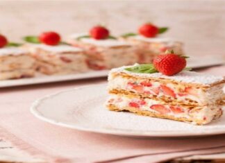 «Κολασμένο» μιλφέιγ γλυκό ψυγείου με μαριναρισμένες φράουλες, κρέμα τυριού και αμύγδαλα