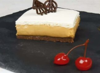 Καραμελωμένο γλυκό ψυγείου με ζαχαρούχο γάλα και μπισκότα έτοιμο σε 5′