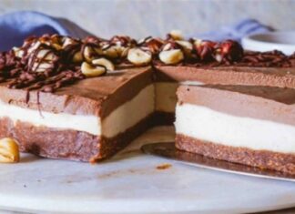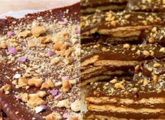 Χωρίς κανένα ψήσιμο: Λαχταριστό γλυκό ψυγείου με cookies, ξηρούς καρπούς και ζαχαρούχο γάλα