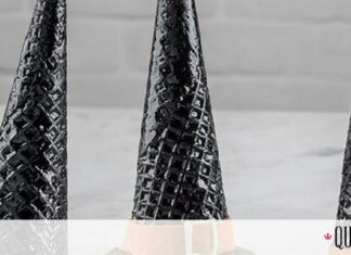 Υλικά: 6 χωνάκια παγωτού10 γρ. μαύρο χρώμα ζαχ/κής σε πάστα300 γρ. κουβερτούρα120 γρ. βούτυρο, σε θερμοκρασία δωματίου250 γρ. ζάχαρη άχνη1/2 κ.γ. εκχύλισμα βανίλιας1-2 κ.σ. γάλα160 γρ. μπισκότα β...