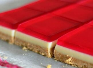 Δροσερό γλυκό ψυγείου με μπισκοτένια βάση, ζαχαρούχο γάλα και επικάλυψη ζελέ