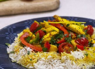 Συνταγή για κοτόπουλο με πιπεριές, ντοματίνια και ρύζι μπασμάτι